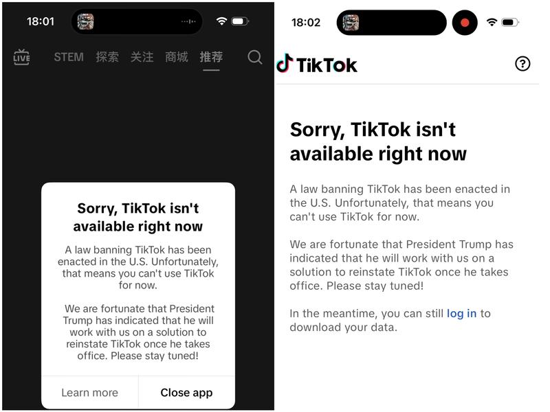 TikTok也在利用最后一刻全力留住美国区用户。美国当地时间1月18日开始,TikTok就向美国用户推送了暂停服务的弹窗消息,消息显示:“我们感到遗憾的是禁止TikTok的美国法律将于1月19日生效,这迫使我们暂时无法提供服务。我们正在努力尽快恢复在美国的服务。”