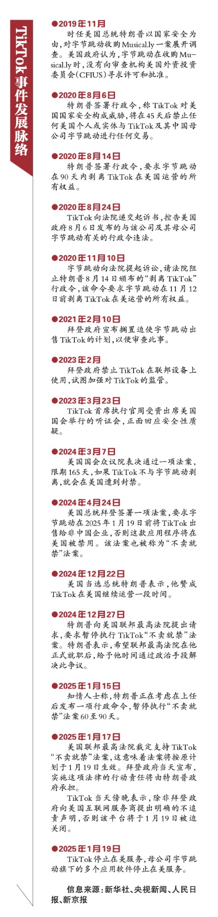 从用行政令要求字节跳动剥离,到“不卖就禁”法案,TikTok近年来在美国的生存形势逐渐收紧。2024年4月,时任美国总统拜登签署一项国会两院通过的法案,要求字节跳动在270天内将TikTok出售给非中国企业,否则这款应用程序将在2025年1月19日后在美国被禁用。本月17日,美国联邦最高法院裁定,TikTok“不卖就禁”的法律不违宪。这意味着联邦最高法院允许该法律按原计划于1月19日生效。